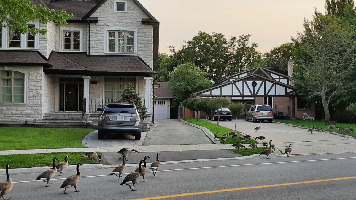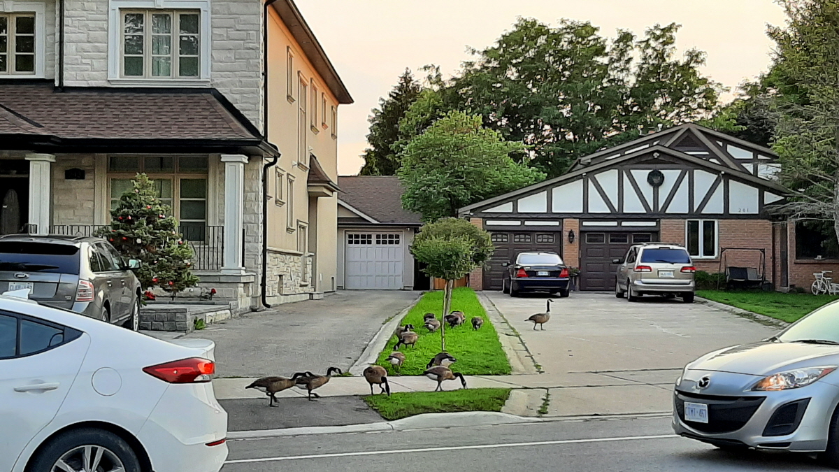 오른쪽 집의 큰 나무 아래의 잔디밭부터 먼저 건너간 놈들이 가득하다. 군대의 사단 병력이 이동하듯이.... 민가로 왜 대이동 중인지 대단히 궁금하다. 물가에 있어야 먹이가 가까이 있는데.