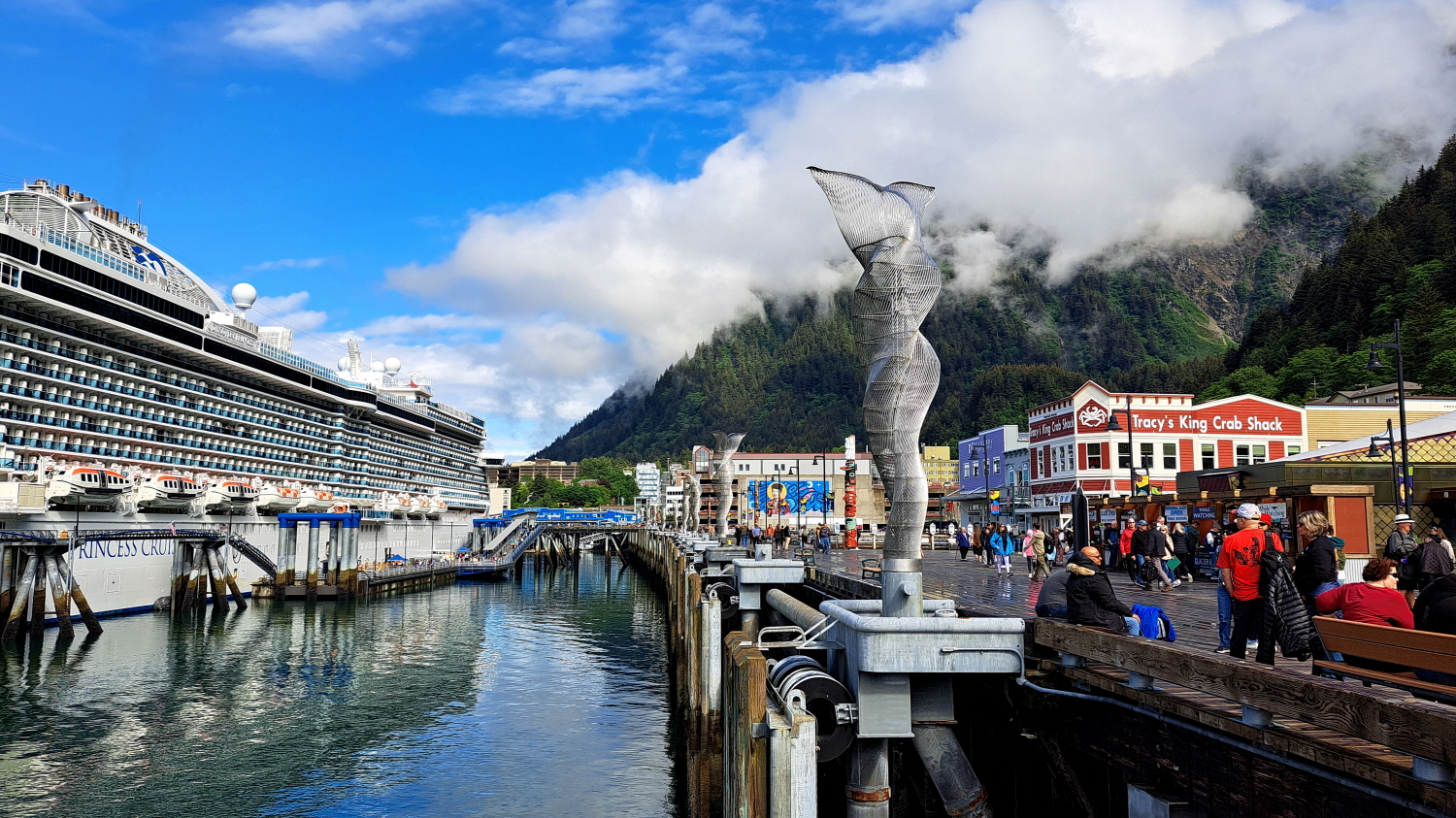 Juneau 시내의 뒤 산 위로 올라가는 Gondola. 코로나바이러스 Pandemic 전에도 $39 이었고 지금은 무려 $50 이다. 엄청난 바가지 요금이다. 다른 기항지의 Gondola 도 $53. Alaska 의 물가가 대단하다지만 곤돌라 요금이 무지막지하게 비싸다. 이렇게 구름이 끼어 있는데 정상에 올라가도 제대로 내려다보이기는 할 지도 궁금하다. 1년 전 Dominican Rep 의 관광지 Puerto Plata 에서 올랐던 비슷한 거리의 곤돌라는 $10 이었다 (현지인들은 $5). 물가가 비싼 Alaska 이라지만, 가까운 거리의 산 위로 오르는 Gondolar 요금이 $50 이다. 으악 !