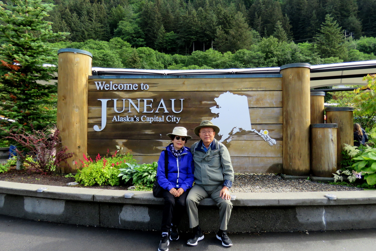 Alaska 의 Capital City 인 Juneau 의 환영 게시판 앞에서 인증 사진을 먼저 찍고 천천히 둘러본다. 우리 여기 왔습니다 !