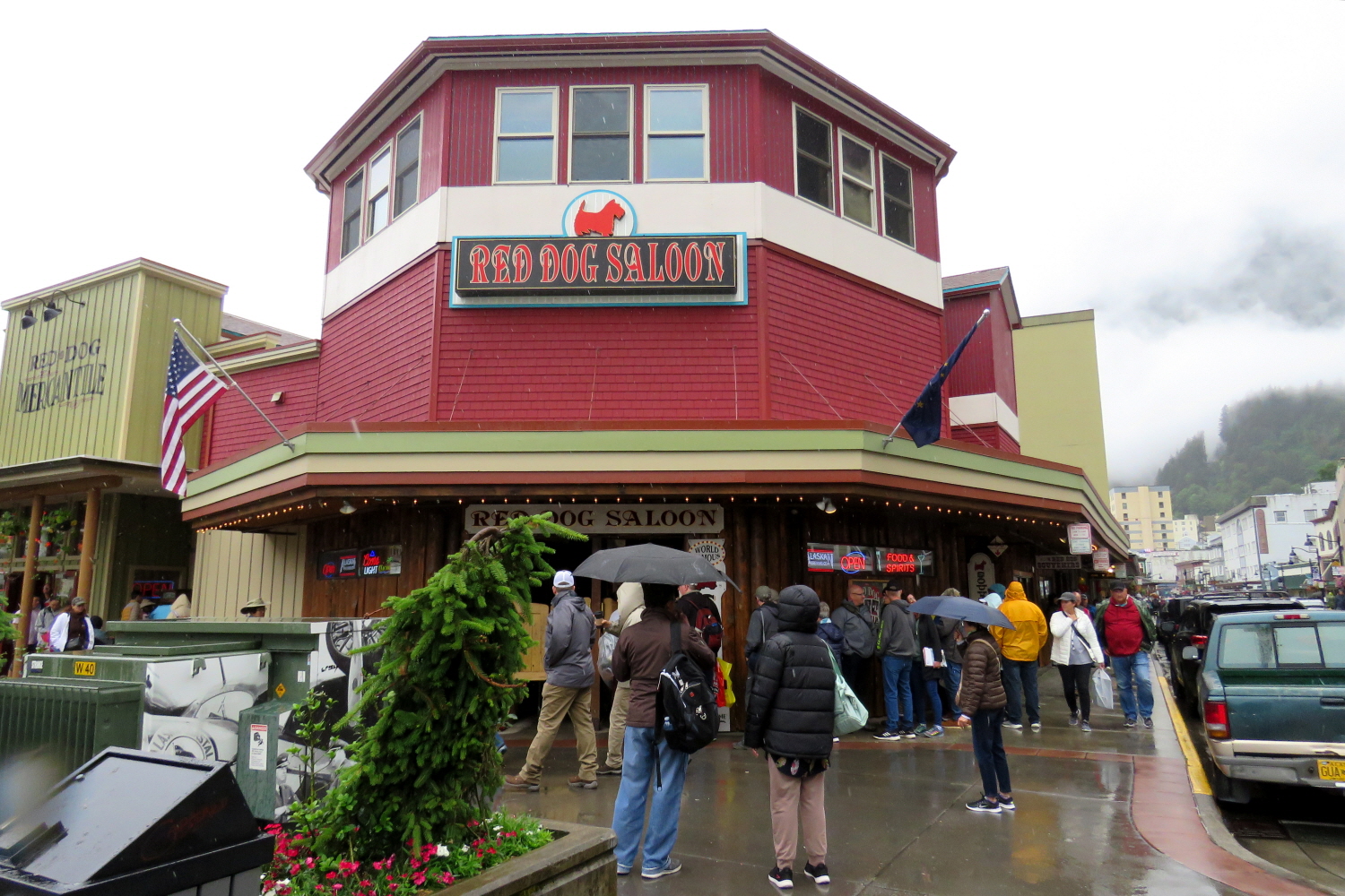 Red Dog Saloon. Gold Rush 시절부터 지금까지도 계속 영업 중인 곳이다. 문 앞을 지나서 옆 인도 길 뒤로 20~30m 의 긴 줄이 늘어져 있다. 벽 위로는 여러 동물들의 박제된 Head 가 Saloon 의 내부를 장식하고 있는 곳이다.