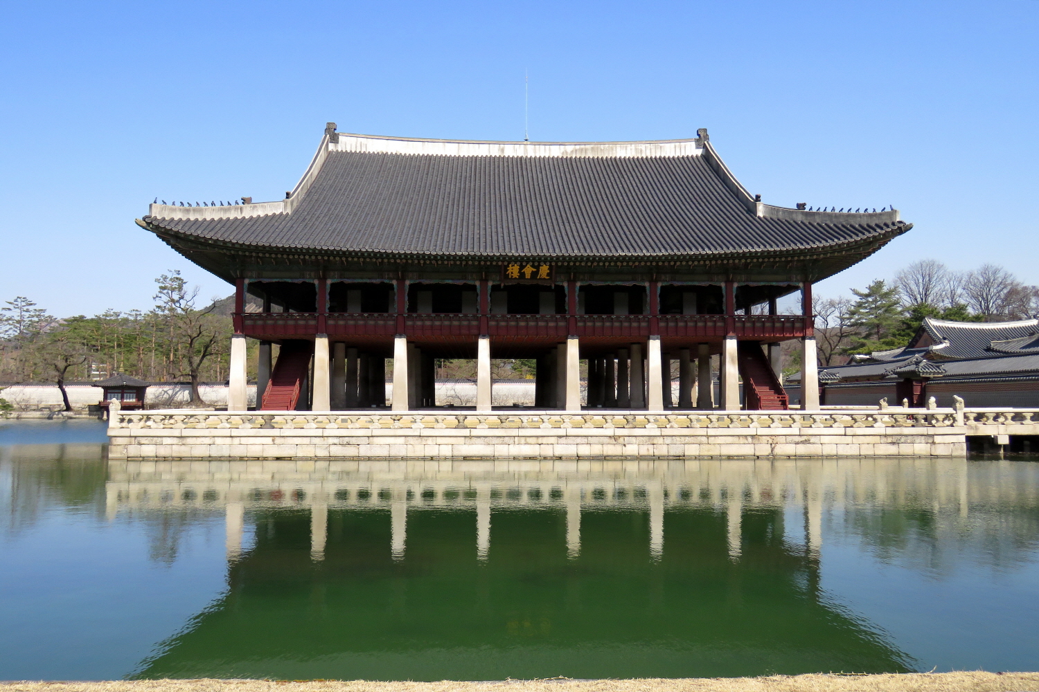 그리고 담을 넘어서 왼쪽에는 국보로 지정된 경회루가 있다. 왕이 신하들에게 큰 연회를 베풀거나 외국 사신을 접대하던 곳이다. 과거시험이나 기우제 등이 열리기도 했던 곳이다.