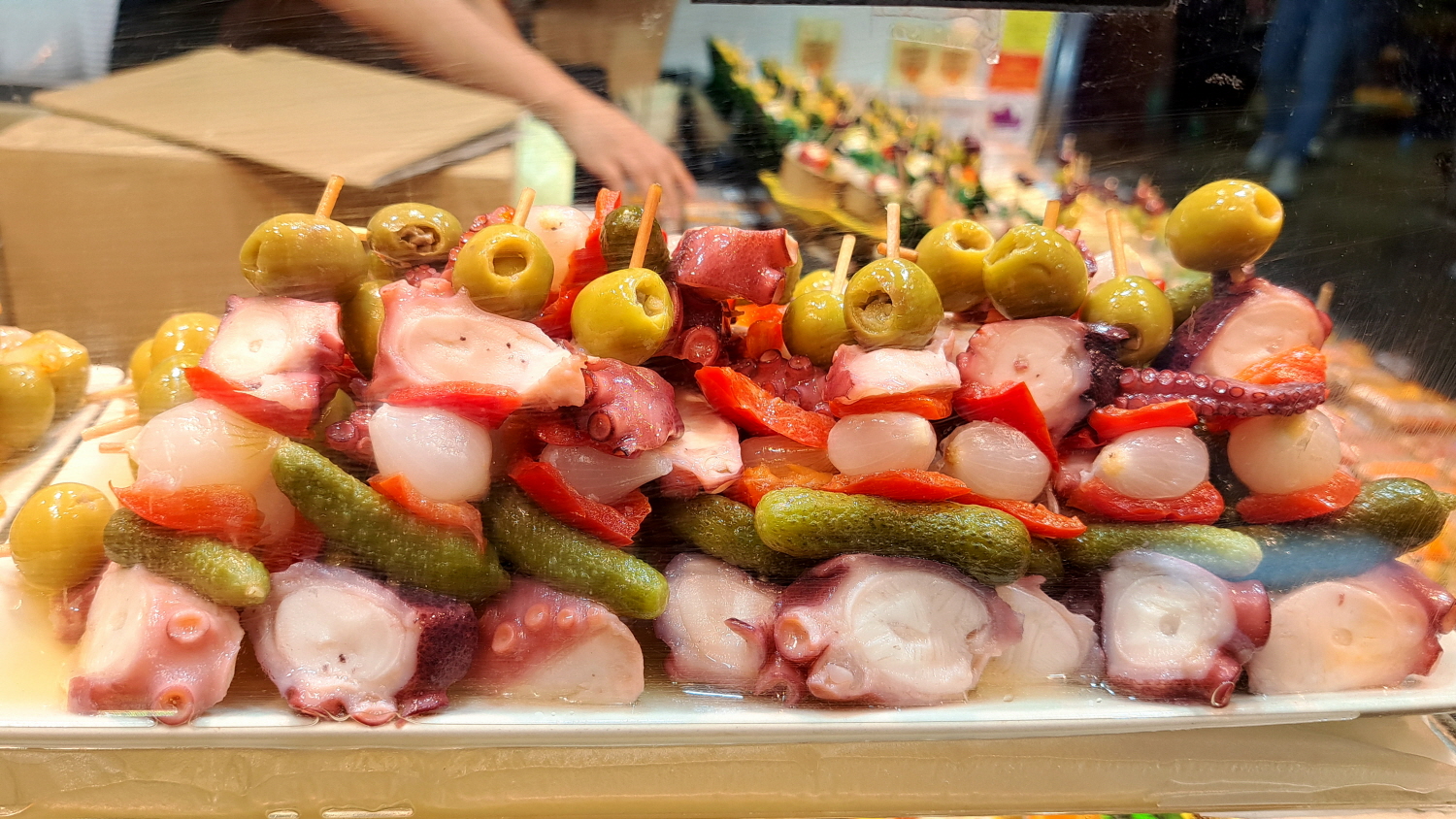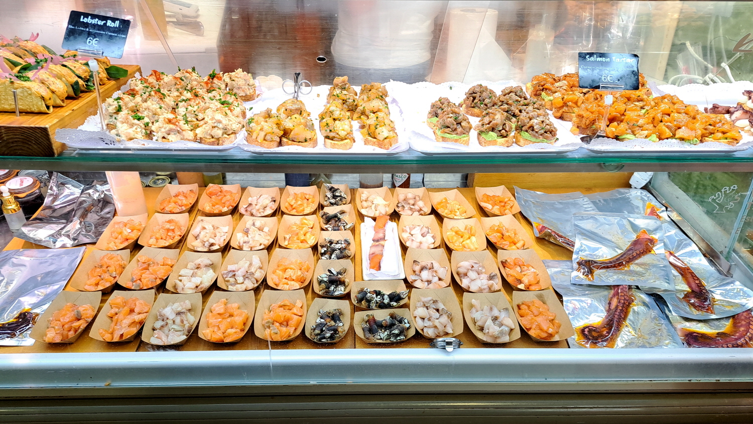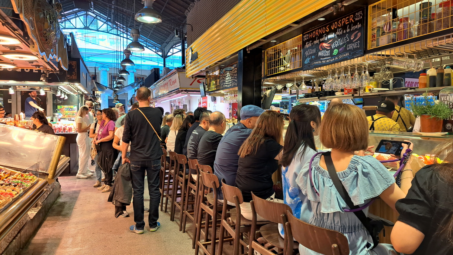 한쪽 구석에서는 해산물, 하몽, 스페인 특유의 안주인 여러 가지 Tapas 를 앞에 놓고 한 잔씩 즐기고 있다. 아직 오전 시간인데도 빈자리는커녕 왁자지껄 대만원이다.