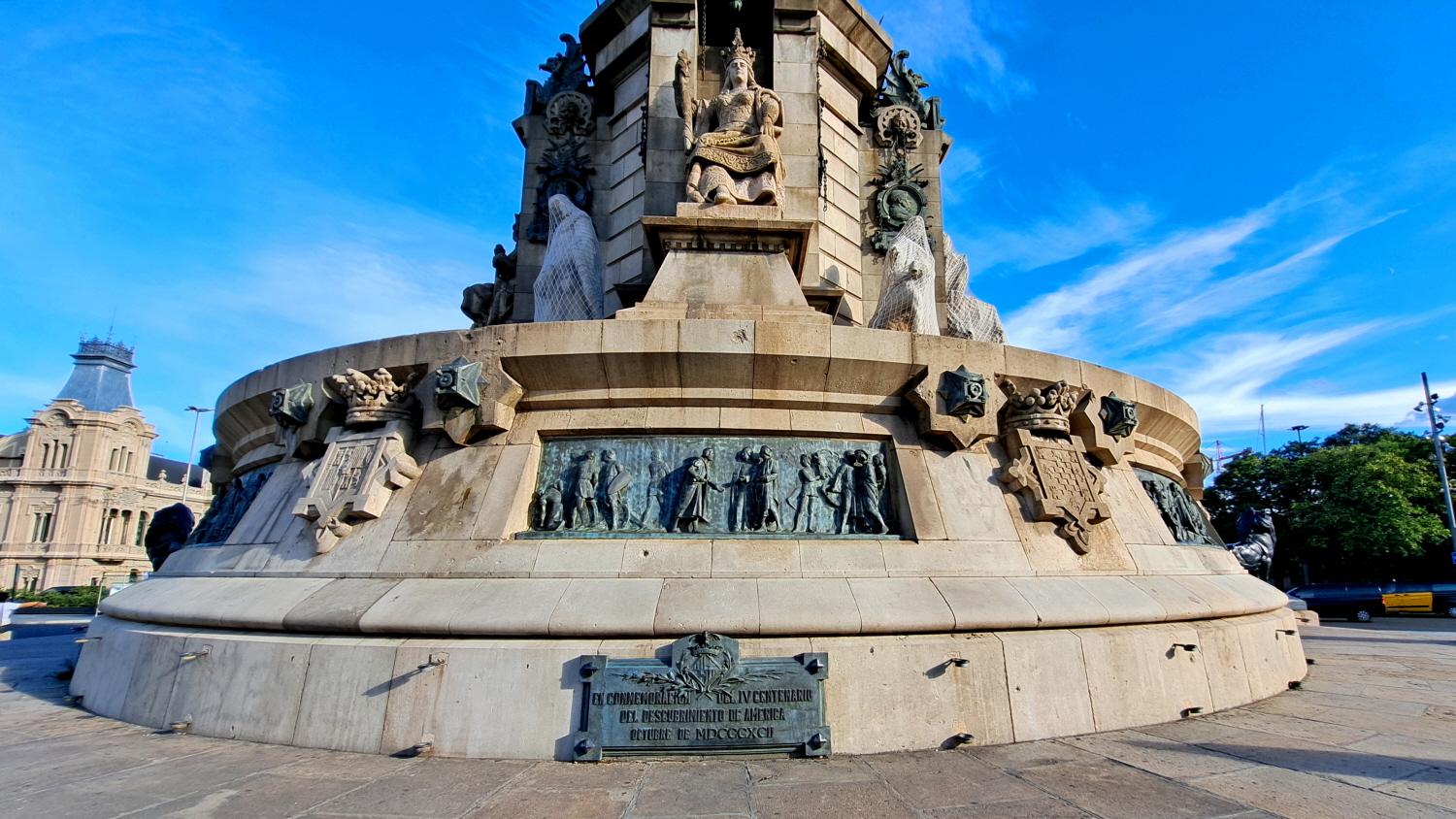 기념비는 'Tierra' - '땅' 이라는 단어가 새겨진 초석 위에 세워졌다. Cordoba 에서 콜럼버스가 페르디난드 왕과 이사벨 여왕을 만나는 모습 등 8조각의 부조가 둘러져 있다.