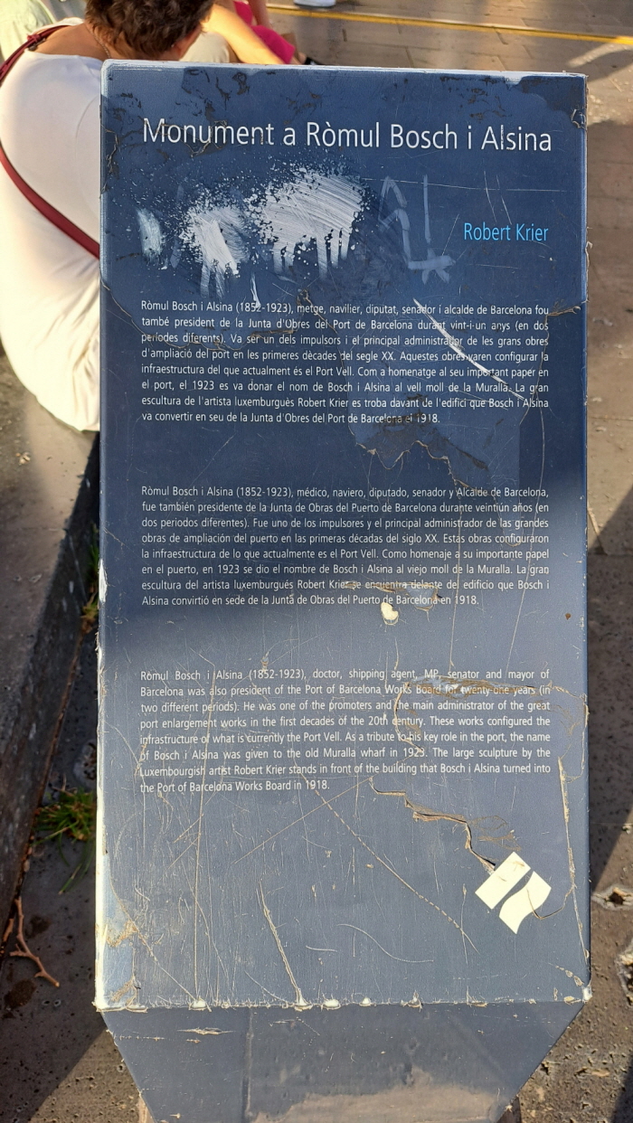 Old Port Authority Building. 구 항구 항만청. 건물마다 모두가 예술품이다. 앞에 서 있는 동상은 누구인가 들여다보니 바셀로나의 역사적 유명 인사이다. Romul Bosch Alsina. 의사, 해운 대리인, 바셀로나 시장, 그리고 항구 확장공사의 추진자이며 관리자였다.