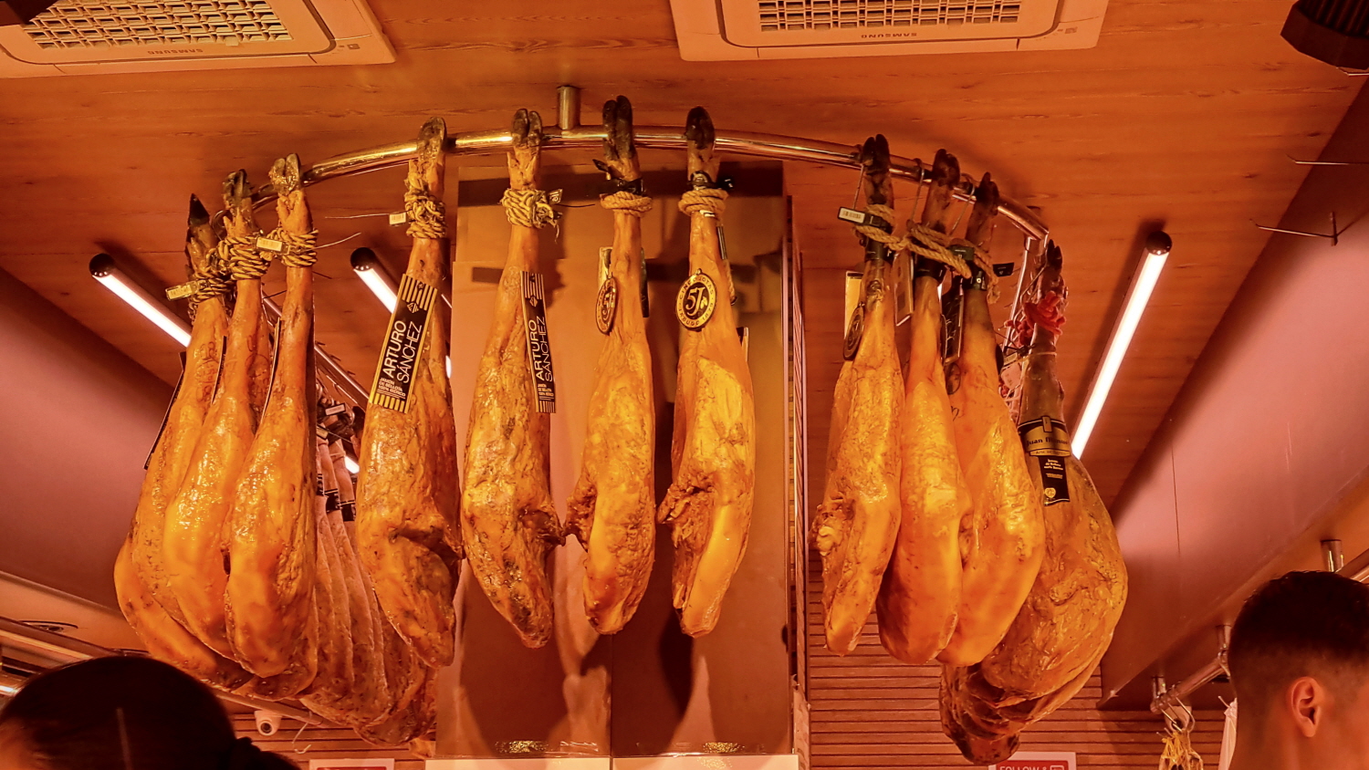 무게는 보통 뒷다리 한 덩어리에 8~9Kg. 대략 900~1,000 유로를 훌쩍 넘는다. 고급품은 훨씬 더 비싸다. 얇게 6~7 조각 정도를 썰어 놓은 것이 100g 이다. 중간 정도의 Tangerine 6 조각 정도의 무게이다. 붙여진 가격이 14~15 유로 정도이다. 엄청나게 짜디짠 하몽 덕분에 콜럼버스가 기나긴 항해를 하며 아메리카 대륙을 발견할 수 있었다고 하는데 수긍이 간다.