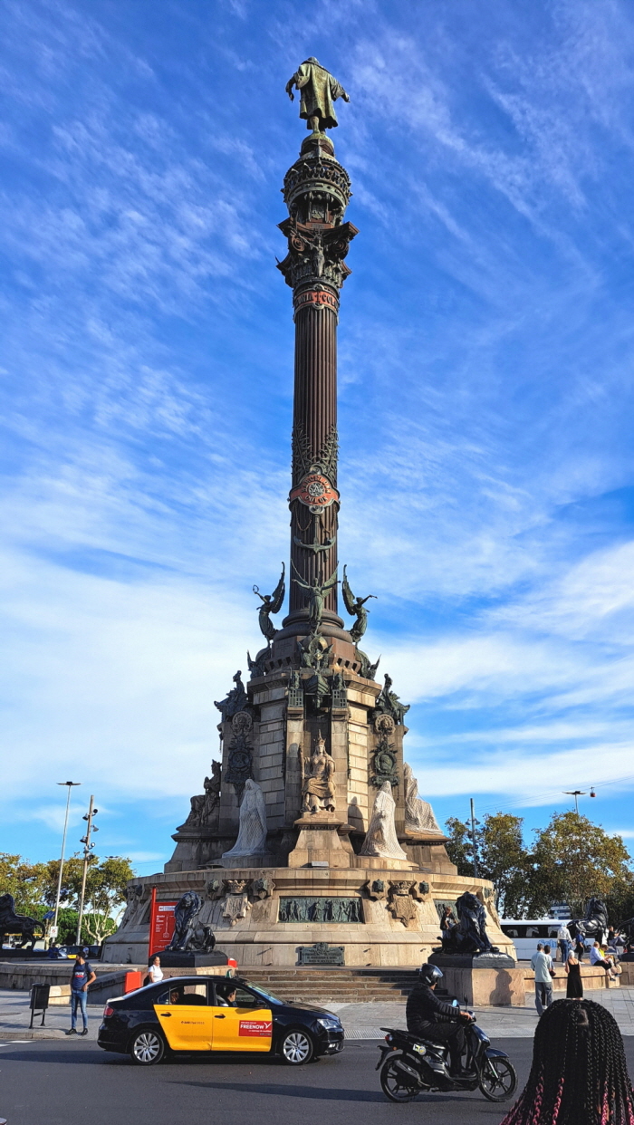 높이 60m 의 기념비. 기념비는 콜럼버스의 America 신대륙 첫 항해를 기념하여 1888년 바셀로나 만국박람회를 위해 만들어졌다. Columbus 가 신대륙으로의 첫 여행을 마치고 바셀로나에서 이사벨라 여왕과 페르디난드 왕에게 보고했다는 것을 상기시키는 기념비이다. 오른손은 신대륙을 가리키고, 왼손에는 두루마리 서류를 들고 있다. 바셀로나에서 가장 유명한 동상이나 기념물 중의 하나이다. La Rambia 거리의 남쪽 부분과 Columbus 산책로가 만나는 바셀로나 항구 입구에 있다. Columbus 가 항구를 향해서 두 팔을 벌리고 서있는 모습이다.