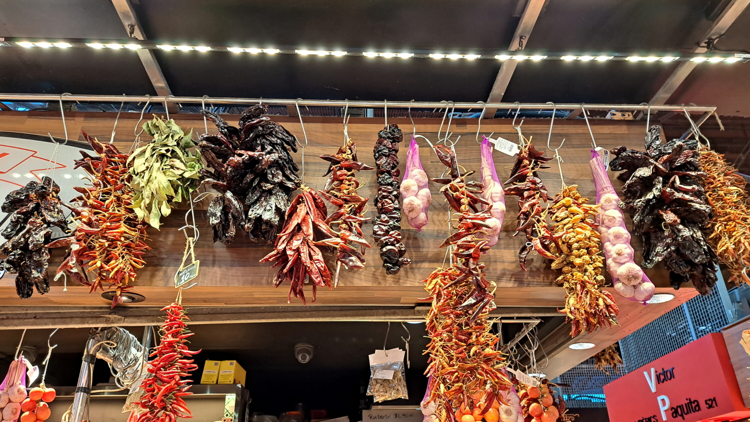 말린 고추와 마늘이 가득하게 걸려있다. 놀랍게도 우리가 애용하는 Spanish Purple Garlic 도 많이 매달려 있어서 더 반갑다. 여러 가지 알지 못하는 말린 식품들이 줄줄이 걸려있다.